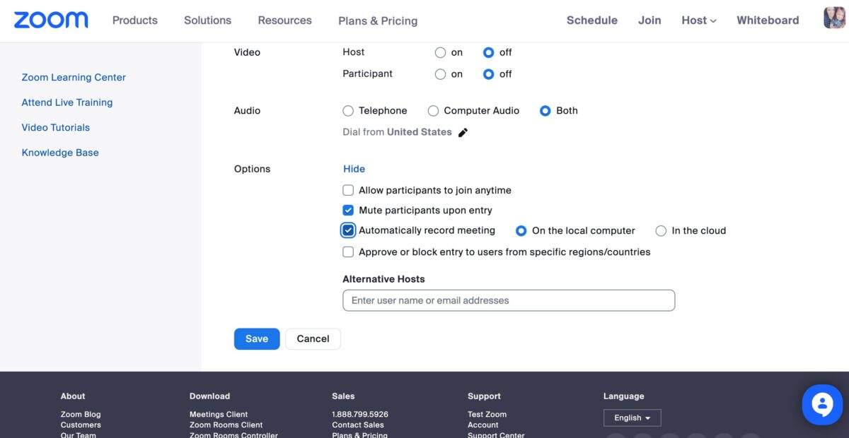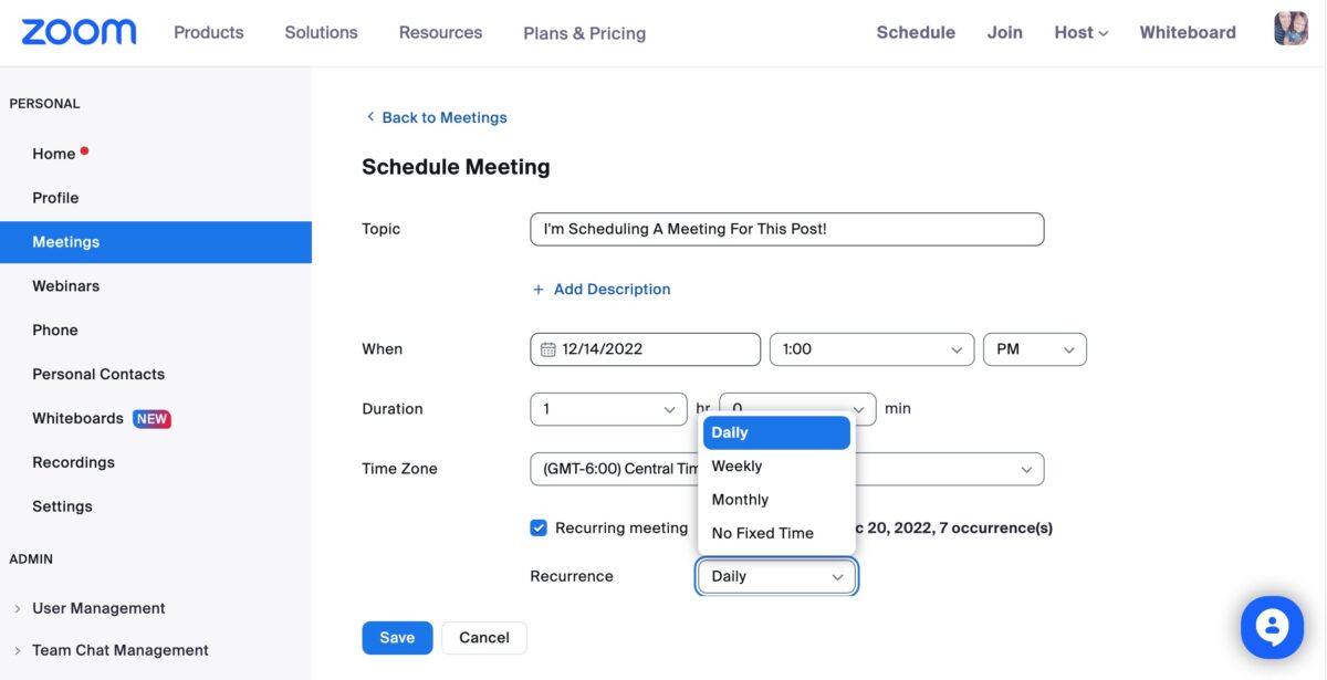 Um sicherzustellen, dass das Meeting eingerichtet wurde, klicken Sie auf die blaue Schaltfläche „Speichern“. Zoom wird Ihr Meeting und die Uhrzeit im Abschnitt „Anstehende Meetings“ eintragen.