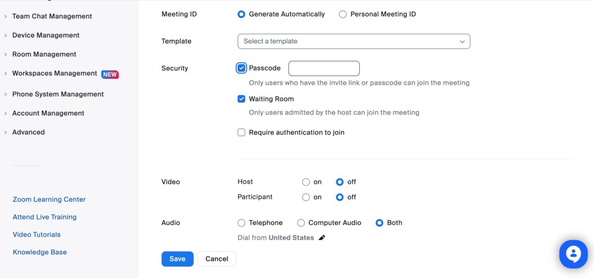 • Meetingraum, Passwort und Authentifizierungsoptionen