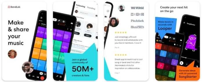 Dies ist eine weitere beliebte und glaubwürdige App zum Musizieren für Android. BandLab gilt als die beste App zum Aufnehmen von Musik und hat eine riesige Nutzerbasis. Mit dieser App können Sie sich mit anderen Musikschaffenden verbinden und Ideen, Beats und Soundtracks austauschen. Mit dieser App können Sie Musik machen und teilen. Ihr Können spielt in diesem Fall keine Rolle.