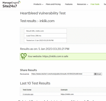 Site24x7. com bietet ein kostenloses Online-Tool zur Heartbleed-Überprüfung an. Dies ist ein einfaches Tool, bei dem Sie den Domänennamen eingeben können, um die Prüfung durchzuführen. Innerhalb von Sekunden zeigt es Ihnen, ob die Domain anfällig für Heartbleed ist oder nicht. Daneben generiert es auch eine kleine Tabelle, in der Sie die Ladezeit der Domain zusammen mit dem getesteten Datum erhalten. Außerdem erhalten Sie eine Schaltfläche, um einen neuen Test durchzuführen. Auf diese Weise können Sie Heartbleed-Schwachstellentests auf mehreren Domains durchführen.