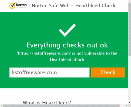 Norton ist ein Antivirenprogramm, das mehrere Sicherheitstools und Maßnahmen zum sicheren Surfen im Internet bereitstellt. Unter anderem bietet die Website auch ein Heartbleed-Testtool. Dies ist ein einfaches Tool, mit dem Sie die Domäne hinzufügen können, um die Prüfung auszuführen. Anfangs ist die Schnittstelle rot. Nach der Prüfung wechselt es für sichere Domänen auf grüne Farbe. Ansonsten bleibt es gleich. Außerdem zeigt es im Gegenzug auch die Ergebnisse an, ob die Domain sicher für die Heartbleed-Schwachstelle ist oder nicht.