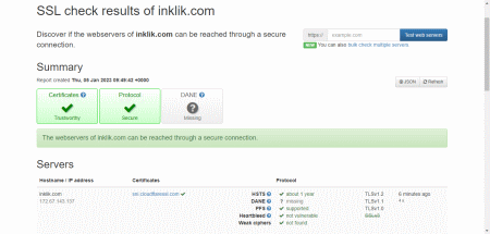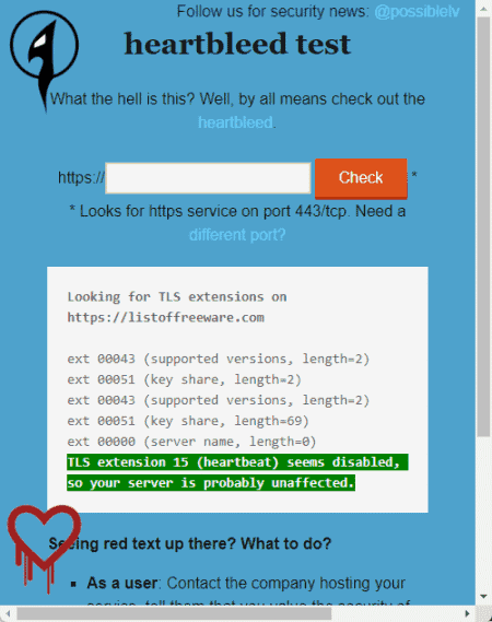 Möglich. lv ist eine weitere Website, auf der Sie den Heartbleed-Schwachstellencheck online durchführen können. Es verfügt über ein Tool, mit dem Sie Ihre Domain-URL hinzufügen und den Test ausführen können. Der Test überprüft die TLS-Erweiterungen auf der Website. Innerhalb von Sekunden listet es die TLS-Erweiterungen zusammen mit ihrem Status auf. Basierend darauf sagt es Ihnen, ob die Domain anfällig für Heartbleed ist oder nicht.