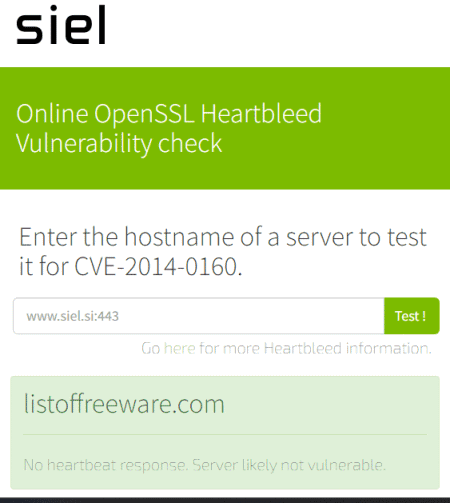 Siel. si ist eine weitere Website, die Online-Heartbleed-Checks anbietet. Das Tool hier hat einen Eingabebereich, in dem Sie die Domain-URL hinzufügen müssen. Wenn Sie einen bestimmten Port überprüfen möchten, können Sie diese Portnummer zusammen mit der Domäne hinzufügen und die Überprüfung durchführen. Das Testergebnis zeigt Ihnen, ob die Domain angreifbar ist oder nicht.