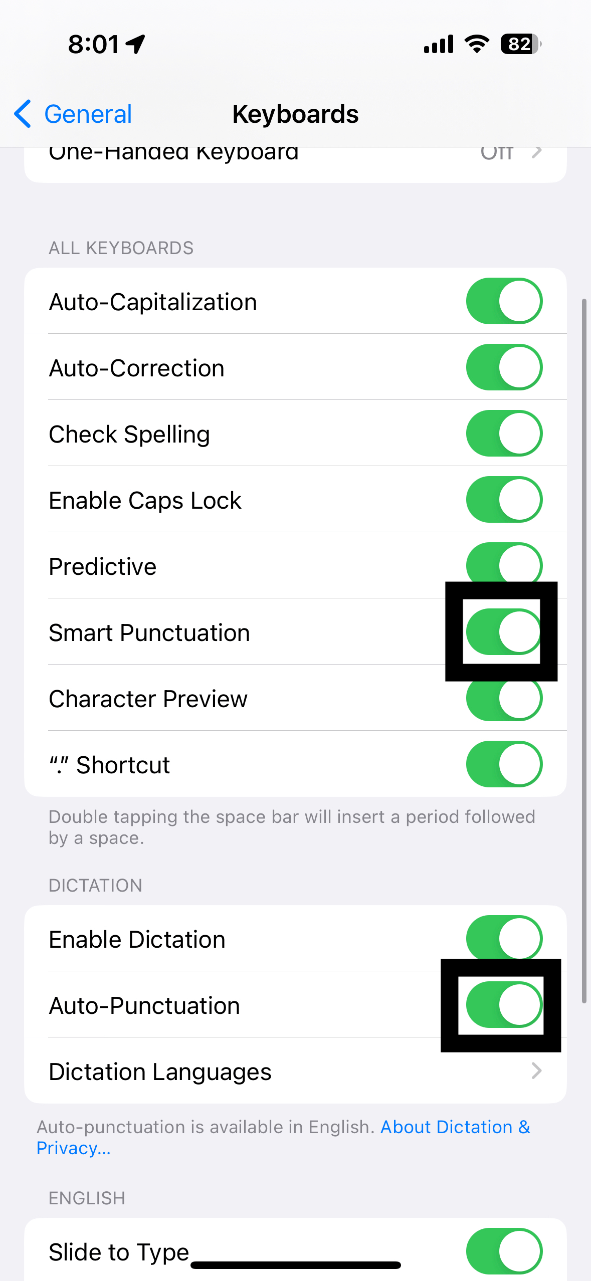 Gehen Sie zu Einstellungen > Allgemein > Tastatur > und deaktivieren Sie Auto-Interpunktion unter Diktat. Gehen Sie zu Einstellungen >Allgemein > Tastatur und deaktivieren Sie Intelligente Zeichensetzung unter”Alle Tastaturen”.