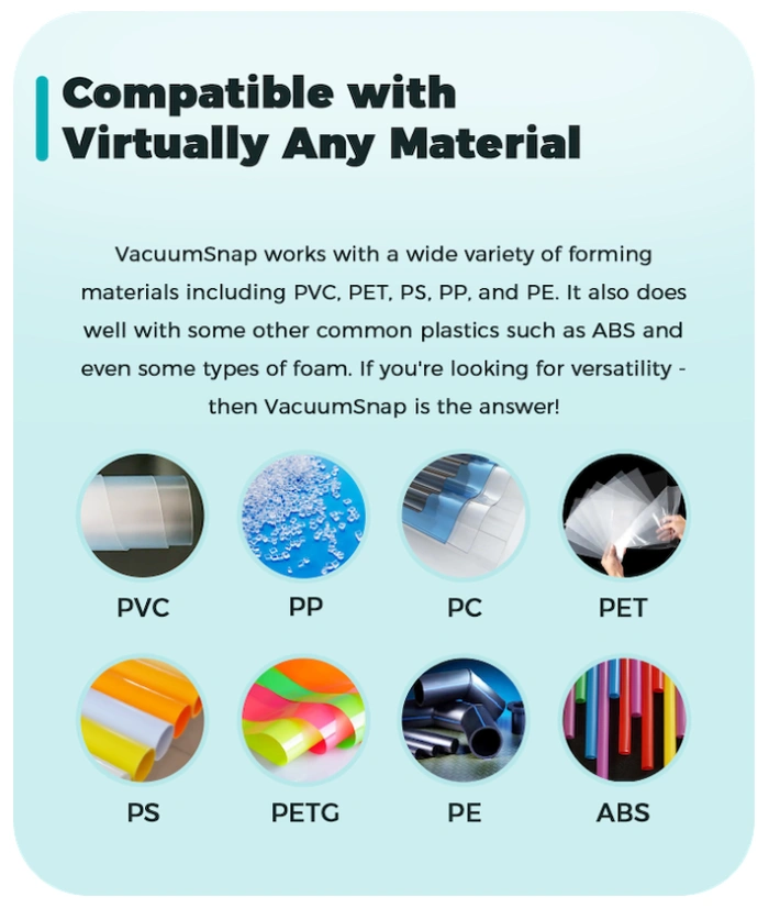 „VacuumSnap produziert eine beispiellose Vakuumleistung mit einer Vakuumintensität von 0,7 kW, die die Konkurrenz in den Schatten stellt und schnelle und präzise Kreationen ermöglicht. In Kombination mit schneller, direkter Erwärmung schlägt es die Konkurrenz mit unübertroffener Detailtreue! Die Maschine hat eine runde Form mit einer Formfläche von 400 x 400 x 160 mm, groß genug für selbst die anspruchsvollsten Aufgaben. Mit seiner runden Form kann es kleine Produkte gleichzeitig mit hoher Effizienz herstellen.“