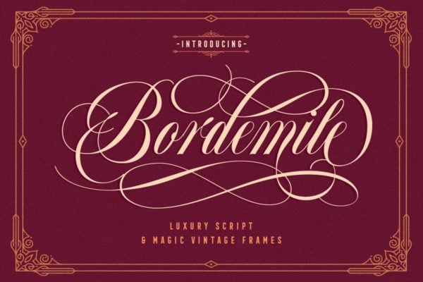 The font kit comes with the Bordemile script also includes a vintage frim in vector format that you can use in your projects. Requiring either Adobe Illustrator, Photoshop, InDesign or Inkscape to use, you can make any branding project have the feel of class and luxury.