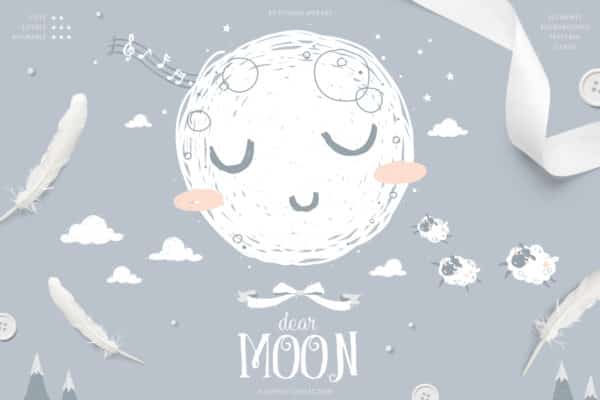 Kompatibel mit Adobe Illustrator CS3 und höher, „Dear Moon“. Set bringt Sie zurück an diesen warmen Ort, an dem Schlummerland der beste Ort der Welt war.