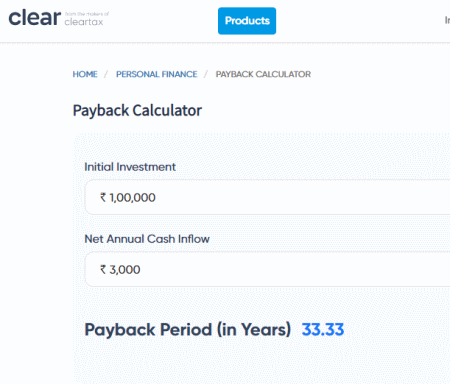 cleartax.in ist eine weitere kostenlose Online-Rechner für die Amortisationszeit. Es ist eine weitere gute Website, die Benutzern hilft, die Zeit zu berechnen, die eine Investition benötigt, um ihre Kosten zurückzuzahlen. Außerdem wird erklärt, was ein Amortisationsrechner ist und welche Formeln und Methoden er zur Berechnung der Amortisationszeit verwendet. In Bezug auf die Eingabewerte sind nur die Anfangsinvestition und der jährliche Netto-Cash-Zufluss erforderlich. Befolgen Sie nun die nachstehenden Schritte.