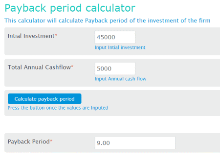 efinancemanagement.com ist ein weiteres Kostenloser Online-Rechner für die Amortisationszeit Diese Website enthält einen einfachen Rechner für die Amortisationszeit, der die Anfangsinvestition und feste jährliche Cashflow-Werte verwendet, um die Amortisationszeit zu berechnen. Es erklärt auch den Prozess der Berechnung der Amortisationszeit zusammen mit mehreren Beispielen. Befolgen Sie nun die nachstehenden Schritte.