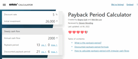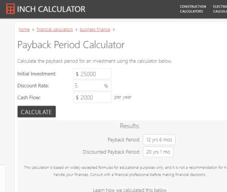 Es ist eine weitere gute Online-Rechner-Website für die Amortisationszeit, die alle Tools zur Berechnung der Amortisationszeit einer Investition bietet.