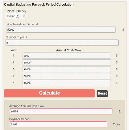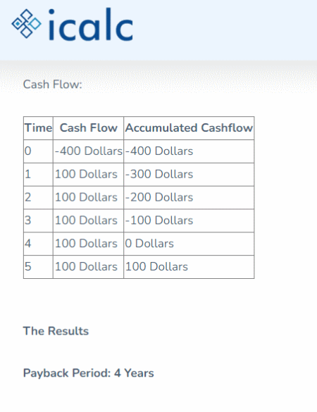 Es ist eine weitere leistungsfähige Online-Rechner-Website für die Amortisationszeit, die die Amortisationszeit einer Investition mit einem festen jährlichen Cashflow-Betrag berechnen kann.