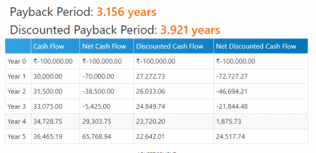 Besuchen Sie diese Website und wählen Sie entweder Fester Cashflow oder Unregelmäßig Cashflow Amortisationsrechner. Geben Sie danach die Anfangsinvestition, den Cashflow pro Jahr, die Erhöhung des Cashflows pro Jahr, den Diskontierungssatz usw. als Eingabeparameter ein. Klicken Sie abschließend auf die Schaltfläche Berechnen, um die berechnete Amortisationszeit, die diskontierte Amortisationszeit und den Prozentsatz der Cashflow-Rendite pro Jahr anzuzeigen.