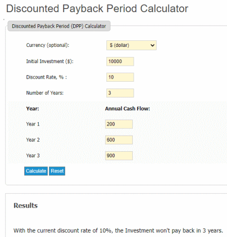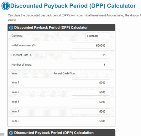 Gehen Sie über den angegebenen Link zu dieser Website. Öffnen Sie danach diesen Rechner. Geben Sie als Nächstes die Eingabewerte wie Währungstyp, Anfangsinvestition, Abzinsungssatz in Prozent, Anzahl der Jahre, jährlicher Cashflow usw. ein. Sehen Sie sich schließlich die berechnete diskontierte Amortisationszeit an.
