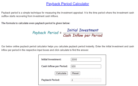 Es handelt sich um eine weitere leistungsfähige Online-Website zur Berechnung der Amortisationszeit, die auch die Formel hervorhebt, die zur Durchführung der Berechnungen verwendet wird.