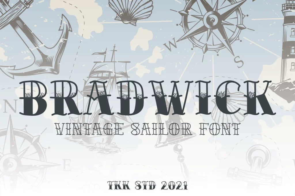 BRADWICK ist ein weiteres hervorragendes Schriftartenpaket, das nicht zu weit von Starker Westen. Als Vintage-Seemannsschrift bezeichnet, ist dies nicht nur eine großartige Tattoo-Schrift, sondern funktioniert auch effektiv als Beschilderung und Überschrift. Beachten Sie jedoch, dass dieses Paket nur Großbuchstaben enthält.