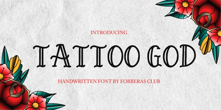 Lust auf wellige Ästhetik? Tattoo God macht großen Gebrauch von einer handgeschriebenen Schriftart. Stilvoll entworfen, um Großbuchstaben hervorzuheben, gibt es auch viele Designs, die Sie mit dieser Option vervollständigen können!