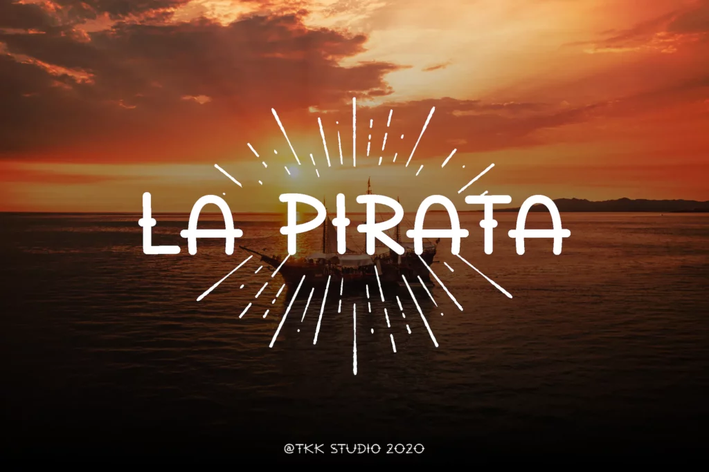 La Pirata ist eine verspielte, von Tätowierungen inspirierte Schriftart. Dieses Paket enthält auch dekorative Elemente im Mittelteil und ist nicht nur eine spektakuläre Option für Tattoo-Schriftarten, sondern sorgt auch für eine großartige Ästhetik für Marketingmaterialien und Beschilderungen.