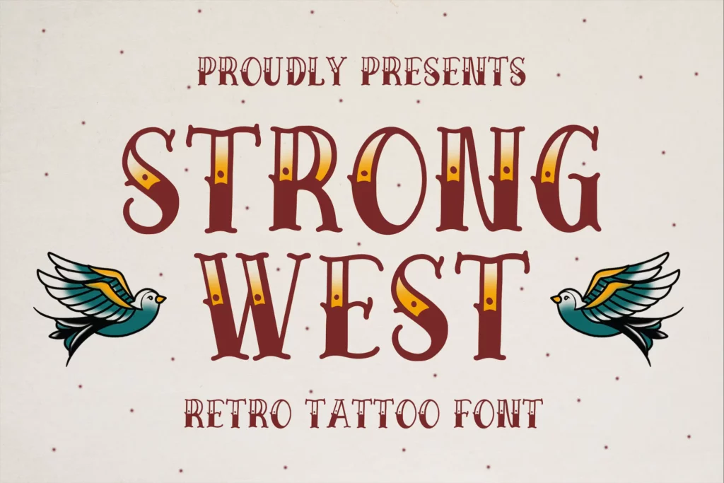 Strong West macht sportlich einen fantastischen Job eine starke Schlagzeilenästhetik, während sie sich gleichzeitig als auffällige Retro-Tattoo-Schriftart verdoppelt. Mit Serifen und zusätzlichen dekorativen Elementen steht dieses wunderschöne Schriftartenpaket definitiv ganz oben auf unserer Liste der besten Tattoo-Schriftarten für Frauen.
