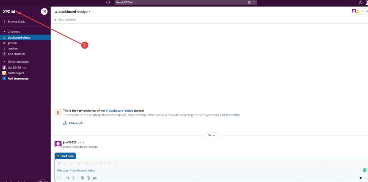 Den Workspace-Namen in der oberen linken Ecke zu finden, ist der erste Schritt beim Löschen eines Slack-Workspace. Der Arbeitsbereichsname befindet sich in der Hauptnavigationsleiste der Anwendung. Sie können auf diesen Arbeitsbereichsnamen klicken, um die Seite mit den Arbeitsbereichseinstellungen zu öffnen. Überprüfen Sie den Pfeilzeiger mit der Nummer eins im Bild.