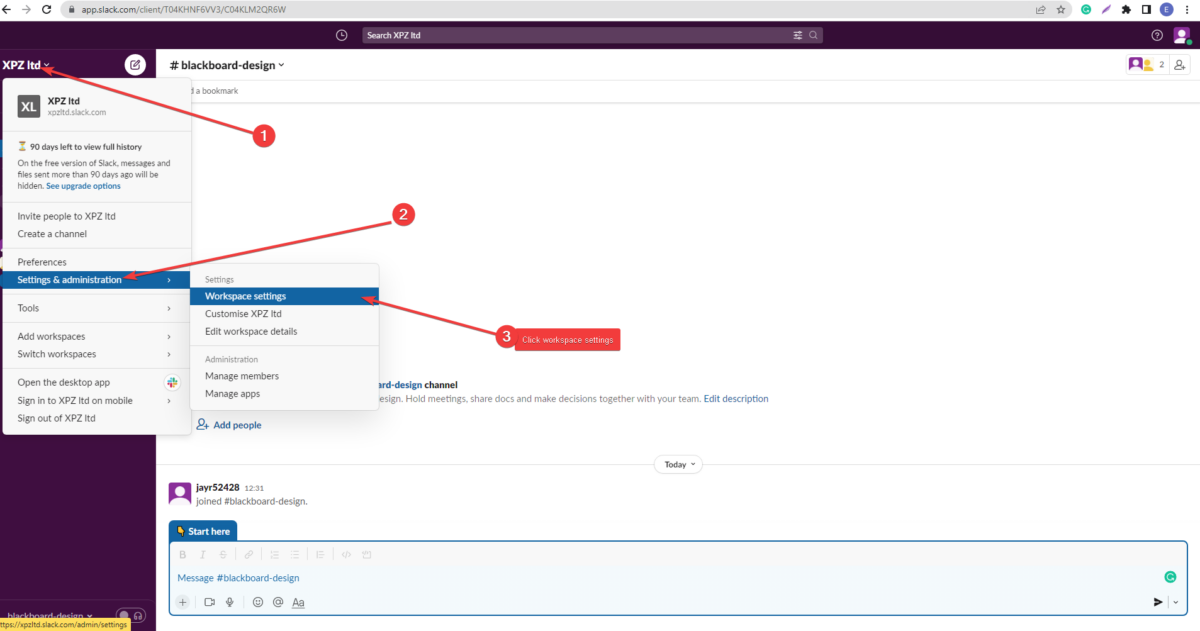 Sobald Sie auf den Namen des Arbeitsbereichs klicken, erscheint ein Dropdown-Menü mit einigen Auswahlmöglichkeiten. Eine dieser Auswahlmöglichkeiten ist Einstellungen & Verwaltung. Sie sollten diese Registerkarte auswählen, um die Seite mit den Arbeitsbereichseinstellungen zu öffnen. Überprüfen Sie das Bild mit Pfeil Nummer zwei. Diese Seite führt Sie dorthin, wo Sie den Arbeitsbereich löschen können.