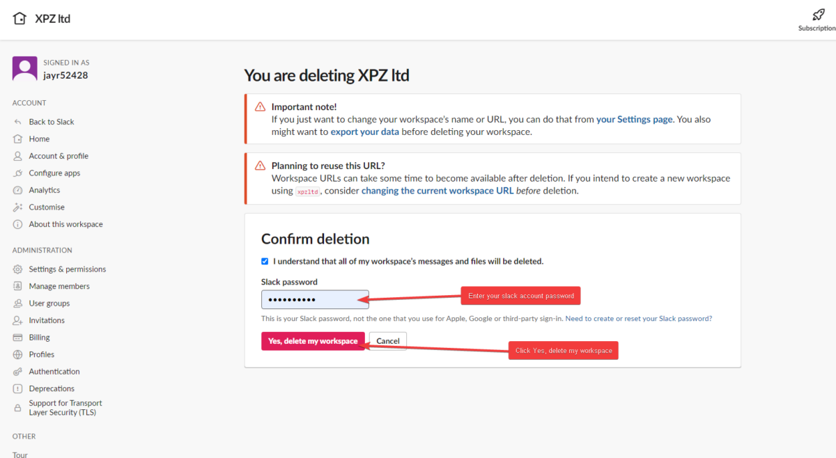 Slack gibt dir die Möglichkeit, das Löschen des Kontos zu bestätigen, bevor du deinen aktuellen Workspace entfernst.