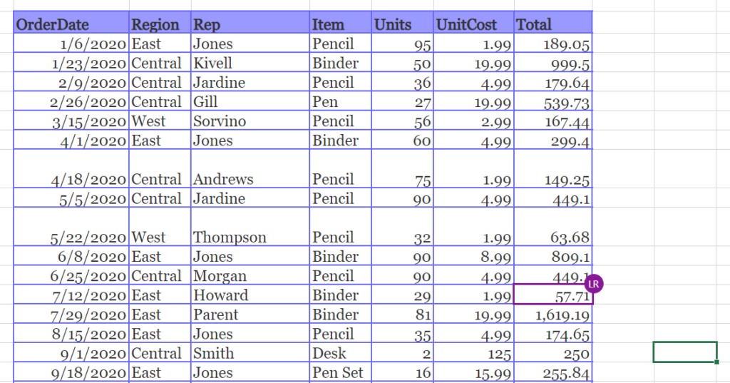 Jetzt, da Lynne die Datei geöffnet hat, sie und ich jetzt kollaborativen Zugriff auf die Datei in Echtzeit haben. Sie werden feststellen, dass Zelle J10 lila hervorgehoben ist und meine Initialen zeigt. Das ist die Zelle, die ich gerade ausgewählt habe. Auf einen Blick sieht jeder Nutzer live, wo die anderen arbeiten. Ziemlich glatt!