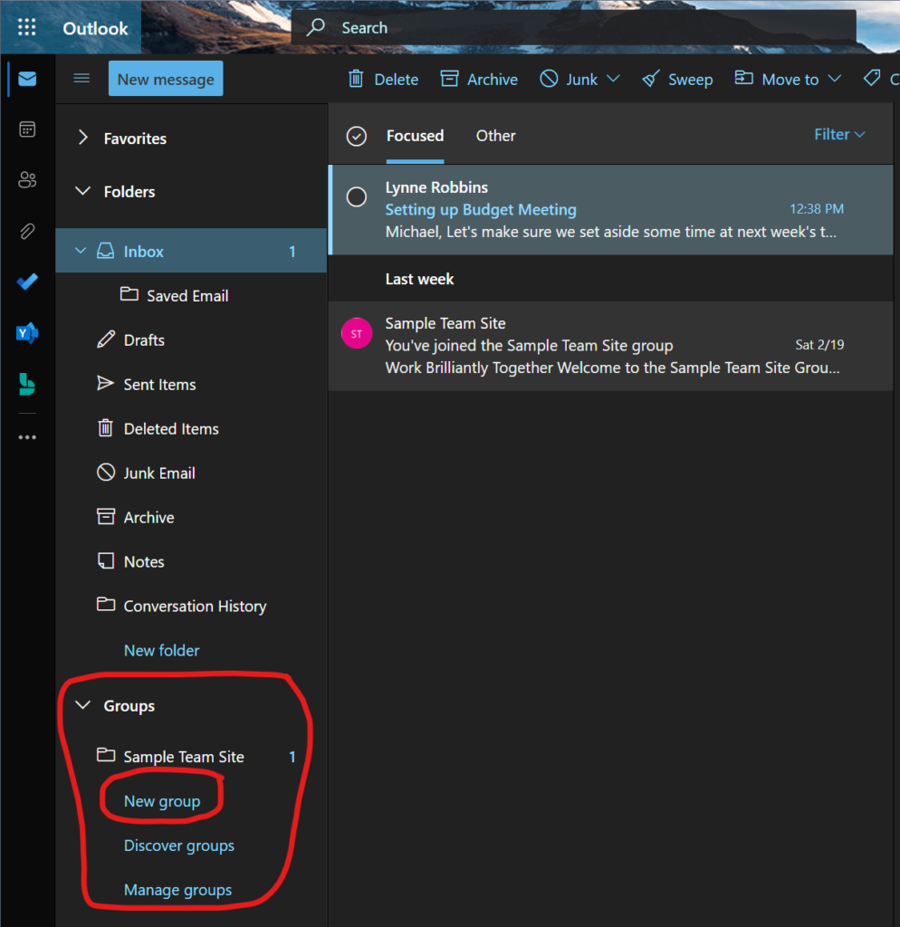 Lassen Sie mich Ihnen zeigen, wie Sie eine Gruppe über Outlook im Web erstellen. Am Ende Ihrer E-Mail-Ordnerliste finden Sie „Gruppen“. Fahren Sie fort und klicken Sie auf „Neue Gruppe“.