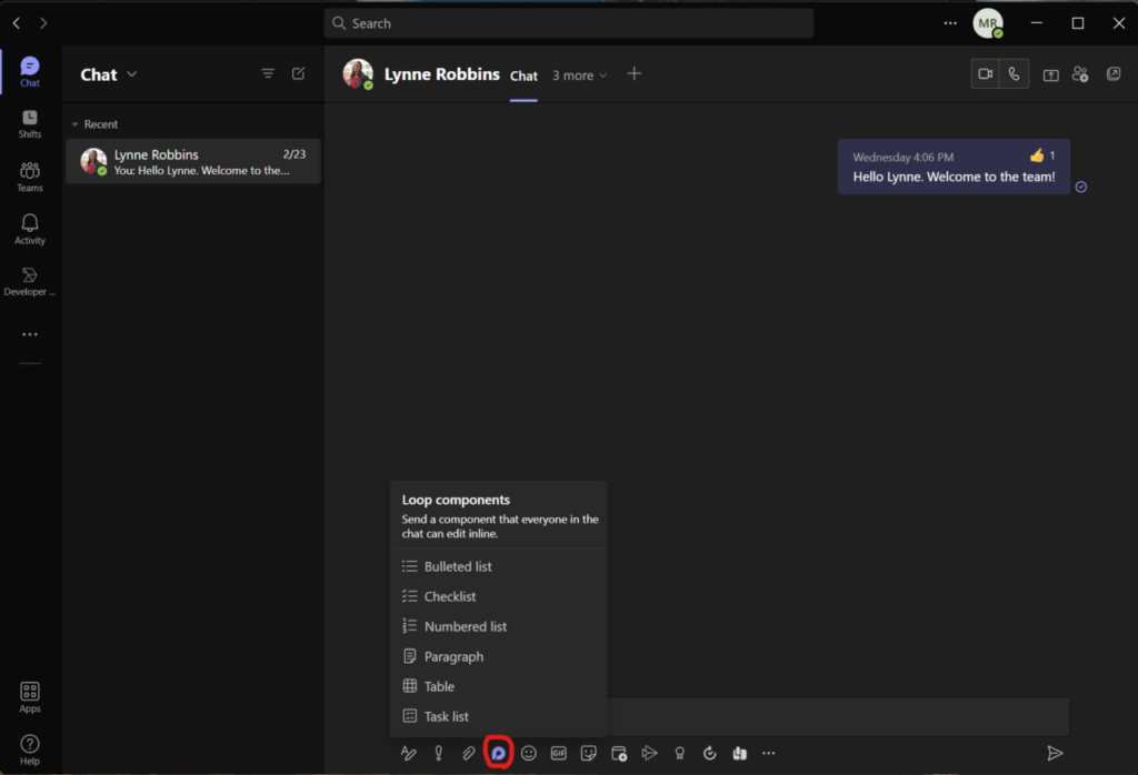 Um zu beginnen, öffnen Sie das Chat-Modul in Microsoft Teams und wählen Sie den Benutzer aus, mit dem Sie zusammenarbeiten möchten. Klicken Sie als Nächstes auf das Symbol für Loop-Komponenten.