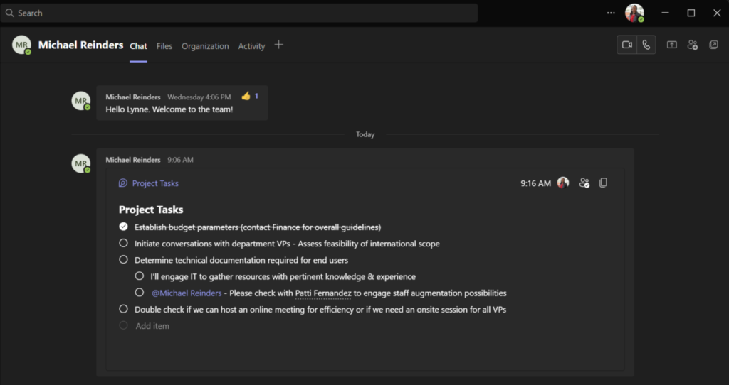 Hier habe ich Checkliste ausgewählt, einige anfängliche Aufgaben für Lynne und mich eingegeben und dann den Freigabebereich von „Jeder in der Organisation“ geändert kann bearbeiten“ auf „Nur in diesem Chat teilen“.