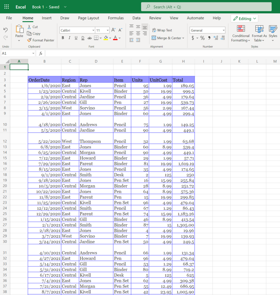 Ich klicke einfach auf die Datei „Verkaufszahlen – 2020–2021“ unter der Kategorie Empfohlen und die Datei wird in Excel geöffnet Online.