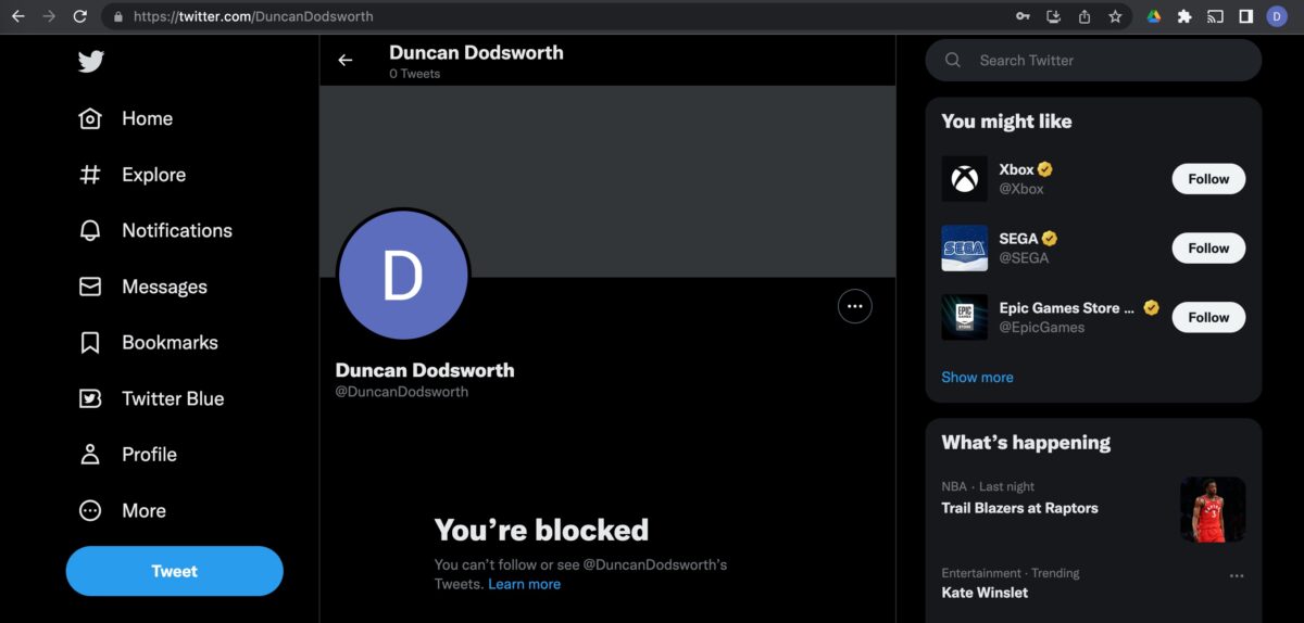 Wenn diese Person Sie blockiert hat, werden Sie keinen ihrer Tweets auf sehen ihre Seite. Stattdessen sehen Sie diese Nachricht: „Sie sind blockiert. Du kannst den Tweets von [Benutzername] nicht folgen oder sie sehen.“