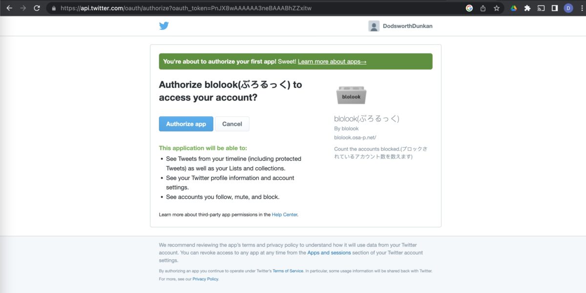 Um zusätzliche Informationen zu Blolook zu sehen, müssen Sie ihnen die Zugriffsberechtigung für Ihr Twitter-Konto erteilen.