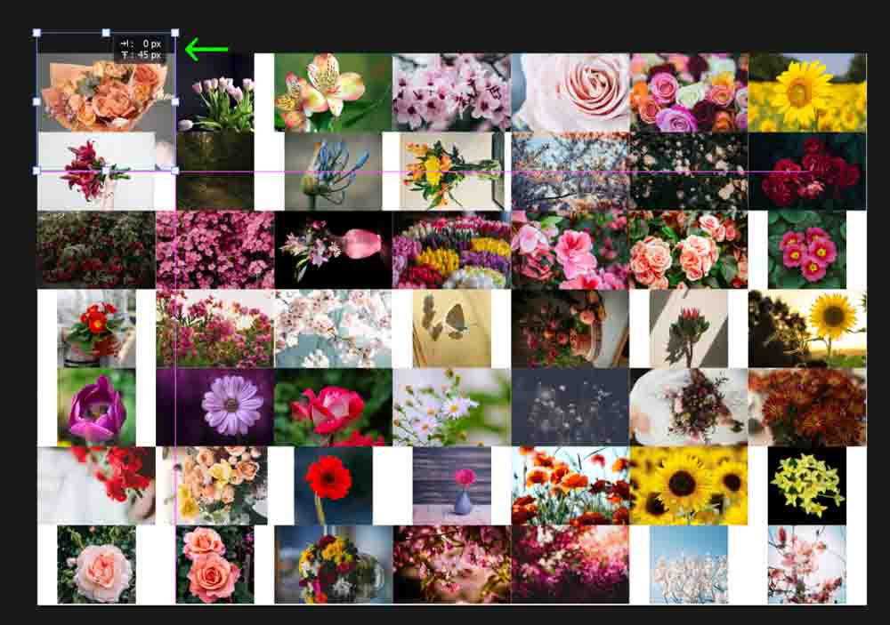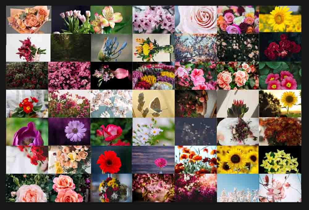 Die Bilder, die ich verwendet habe, stammen von der Stock-Website Pexels. Ich habe 49 verschiedene Blumenbilder für mein Mosaik ausgewählt. In Bezug darauf, wie viele Bilder Sie haben sollten, müssen Sie die Zahl durch sich selbst teilbar sein (mehr dazu später!). 49 Bilder sind 7 x 7. 100 Bilder sind 10 x 10, 25 Bilder sind 5 x 5 und so weiter.