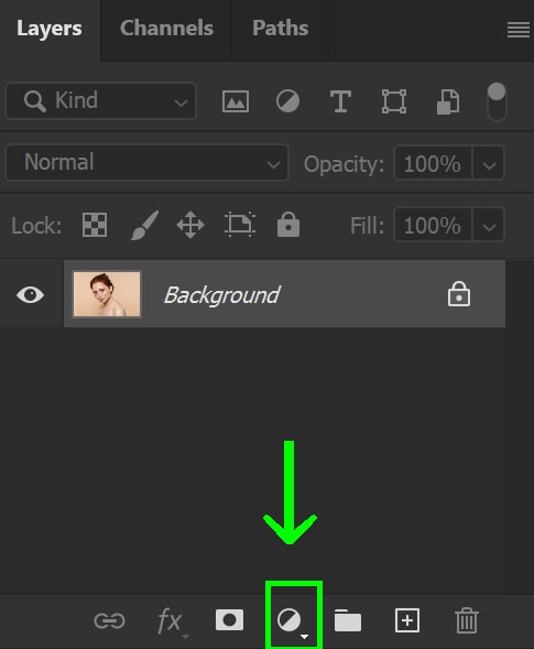 Kehren Sie in Photoshop zu Ihrem Hauptbild zurück. Klicken Sie ganz unten im Ebenenbedienfeld auf das Anpassungssymbol.