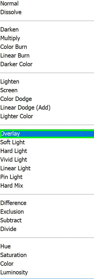 Um den Mischmodus zu ändern, drücken Sie auf das Dropdown-Menü Normal (denn im Moment ist der Mischmodus Normal). Wählen Sie in diesem Dropdown-Menü Overlay aus.