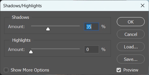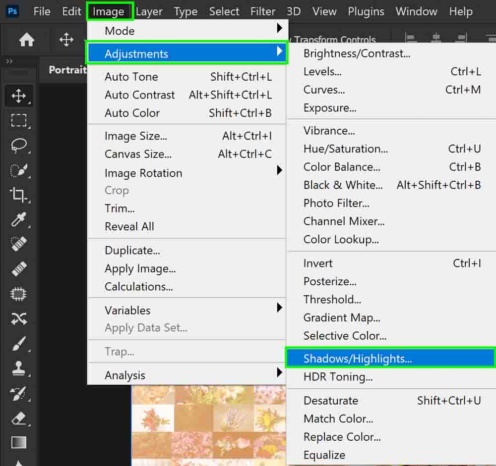 Da ich feststellen kann, dass meine Schatten und Lichter das Kontrastproblem verursachen, werde ich sie mit anpassen Schatten-und Glanzlichter-Schieberegler. Ich kann darauf zugreifen, indem ich zu Bild > Anpassungen > Schatten/Lichter gehe.