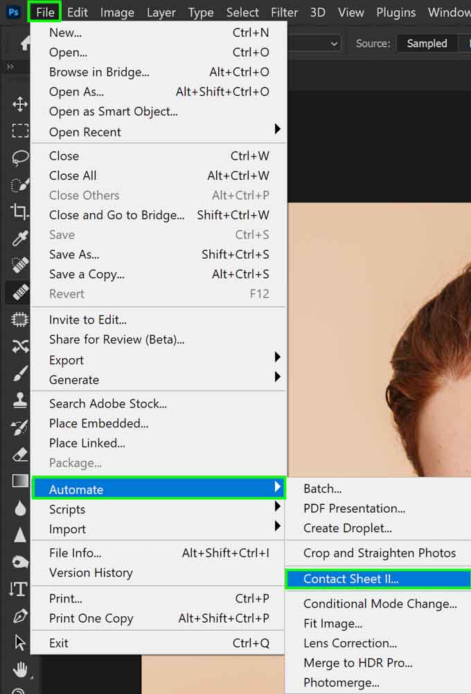 Gehen Sie zu Datei > Automatisieren > Kontaktabzug II.