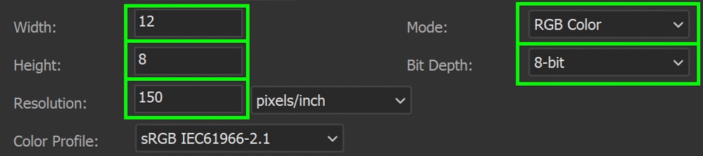 Stellen Sie die Breite auf 12 und die Höhe auf 8 ein, da dies das Seitenverhältnis (Form) von allem ist Fotos im Mosaik haben. Da alle Bilder in meinem Ordner unterschiedliche Seitenverhältnisse haben, werden sie dadurch vereinheitlicht. Stellen Sie die Auflösung auf 150 Pixel/Zoll ein (der Standardwert ist 300, aber das ist zu viel für diesen Zweck). Der Modus sollte RGB-Farbe sein und die Bittiefe sollte auf 8-Bit eingestellt sein.
