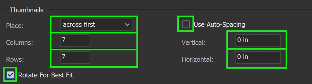 Stellen Sie sicher, dass Auto-Spacing ausgeschaltet (nicht markiert) ist und Ihre Vertical und Horizontal sind auf 0 Zoll eingestellt. Dadurch wird sichergestellt, dass zwischen den einzelnen Bildern kein Leerzeichen vorhanden ist.