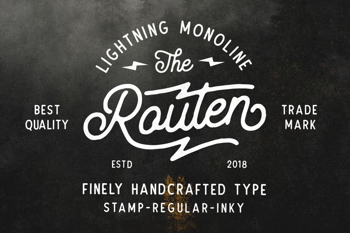 Möchten Sie Ihrer Arbeit einen klassischen Retro-Touch verleihen? Wenn ja, dann Routen Lightning von Martype Co ist genau das, was Sie brauchen! Diese Vintage-Monoline-Schrift hebt einen elektrisierenden Funken und spitze Kanten hervor, die für Volatilität, Kraft und Stärke stehen. Diese Schriftart, die in vier verschiedenen Stilen erhältlich ist, nämlich Routen Stamp, Routen Swash, Routen Regular und Routen Inky, verspricht, die Bedürfnisse des Erstellers besonders zu berücksichtigen. Mit ihrer einzigartigen Ligatur und vielen Alternativen wird die Monoline-Schriftart Routen häufig verwendet, um tolle Logos, Zitate, Karten, Einladungen und mehr zu erstellen. Während die mehrsprachige Unterstützung es weiter darauf vorbereitet, alle Ihre Designanforderungen zu erfüllen.