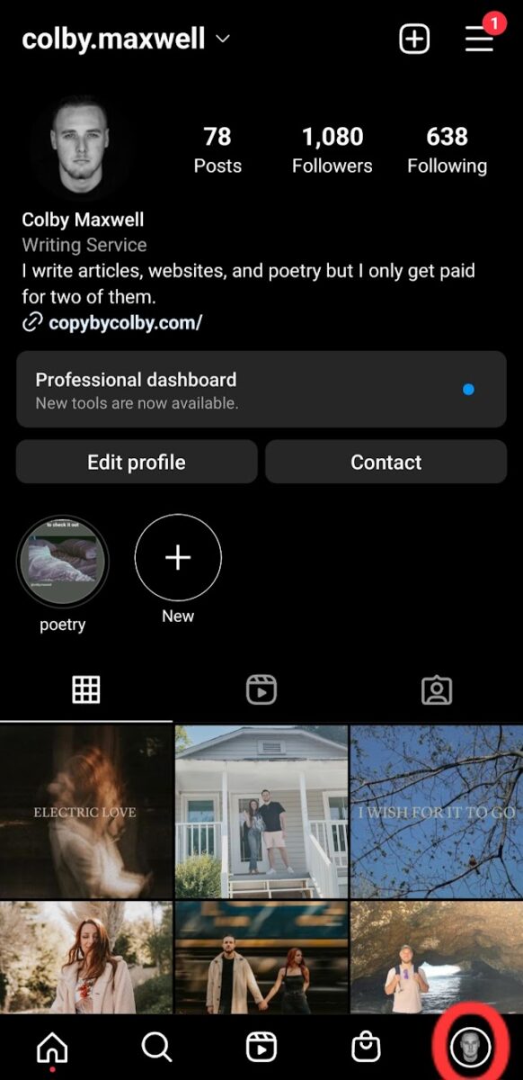 Sobald Sie in der Anwendung sind, schauen Sie unten rechts und finden Sie Ihr Profilbild. Dies ist Ihr Profilsymbol und wenn Sie darauf tippen, gelangen Sie zu Ihrer Profilseite. Ihre Profilseite bietet Ihnen Zugriff auf Ihren Beitragsverlauf und ist der Ort, an dem Sie einige Einstellungen bearbeiten können, wie Ihr Profil angezeigt wird.