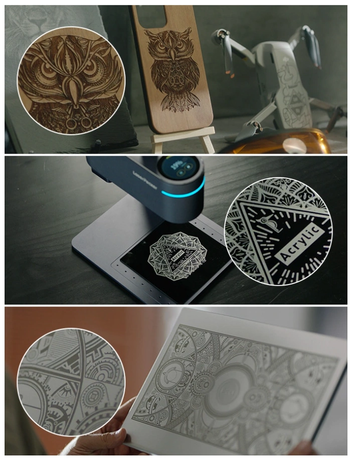 „Was bedeutet eine Auflösung von 8K (1270 dpi)? Das bedeutet, dass die von LaserPecker 4 gravierten Bilder so lebendig sind, als wären sie gedruckt, und dennoch dauerhaft in Ihr Objekt eingraviert. Mit der LaserPecker Slide Extension werden Hochgeschwindigkeits-Galvanometertechnologie und die großflächige Bewegung der CORE XY-Achse perfekt kombiniert damit der LaserPecker4 großflächige Werkstücke mit hoher Geschwindigkeit gravieren kann. „