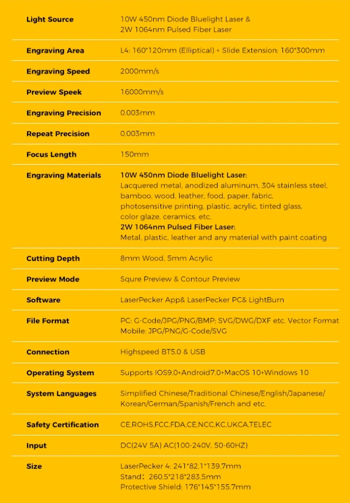 „LaserPecker4 bietet die weltweit einfachste Dual-Laser-Umschaltlösung. Mit einem leichten Wischen auf dem Touchscreen des Geräts können Sie problemlos zwischen zwei Laserquellen wechseln. Es ist keine komplizierte Einrichtung erforderlich; Erledigen Sie die Arbeit ganz einfach in Sekunden. LaserPecker hört nie auf, sich weiterzuentwickeln. Zum ersten Mal hat LaserPecker4 die Gravurgenauigkeit auf beispiellose 8K bis zu einer Körnung von 0,01 mm verbessert. Mit der neuesten Hochgeschwindigkeits-Galvanometer-Technologie erreicht die Gravurgeschwindigkeit von LaserPecker4 bis zu 2000 mm/s.“