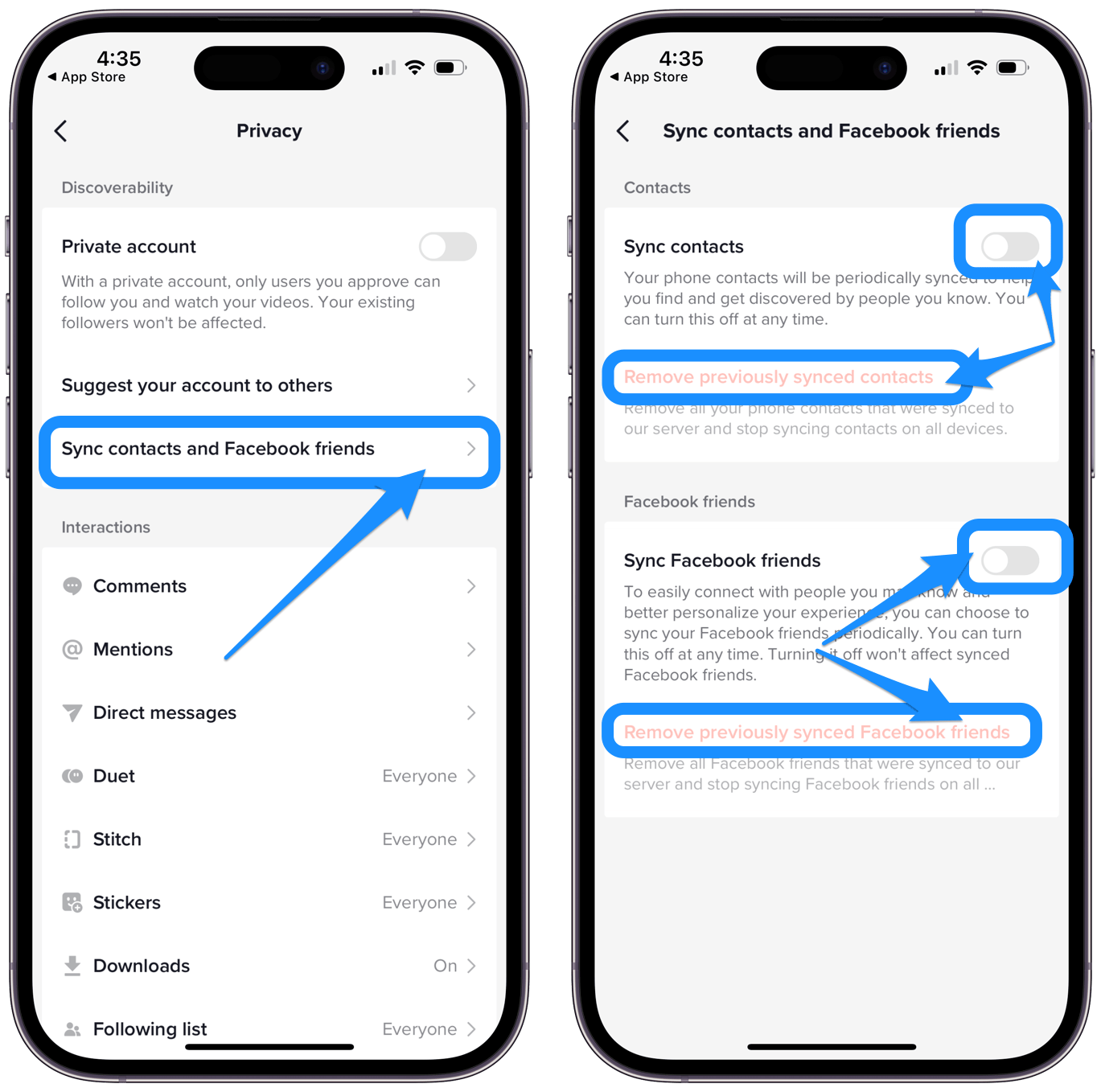 Aktivieren Sie im Einstellungsmenü Datenschutz unter Kontakte und Facebook-Freunde synchronisieren die OptionKontakte synchronisieren und Facebook-Freunde synchronisieren. stark > aus. Wenn Sie zuvor Kontakte synchronisiert haben, können Sie diese auch entfernen. Wählen Sie Zuvor synchronisierte Kontakte entfernen und Zuvor synchronisierte Facebook-Freunde entfernen aus.