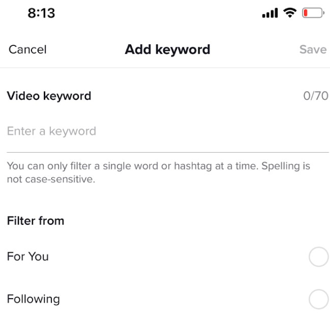 Schritt 5: Tippen Sie auf Keywords hinzufügen und geben Sie ein Wort oder Hashtag ein, das Sie filtern möchten.