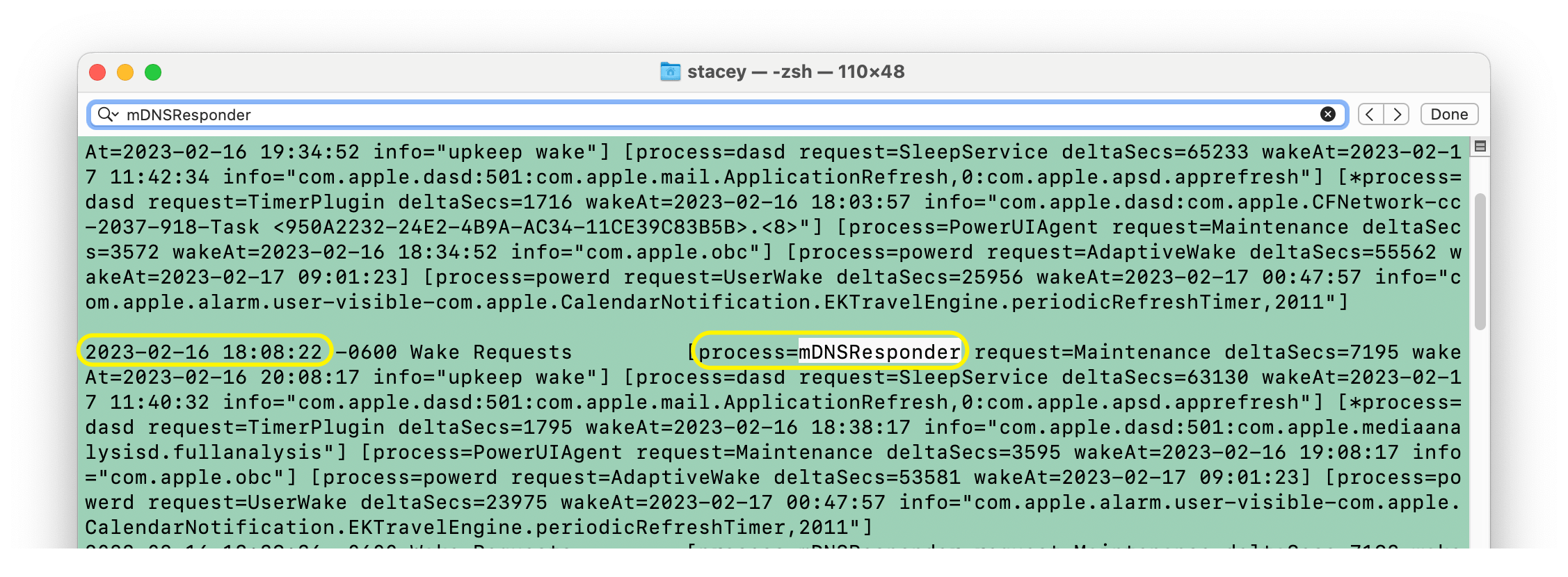 Wenn Sie sich dieses Protokoll ansehen, erfahren Sie, wann Ihr Mac aufgewacht ist und welcher Vorgang jedes Aufwachen verursacht hat. Wenn Sie häufige Reaktivierungen sehen, die durch denselben Prozess verursacht werden, haben Sie möglicherweise Ihren Problemprozess gefunden.