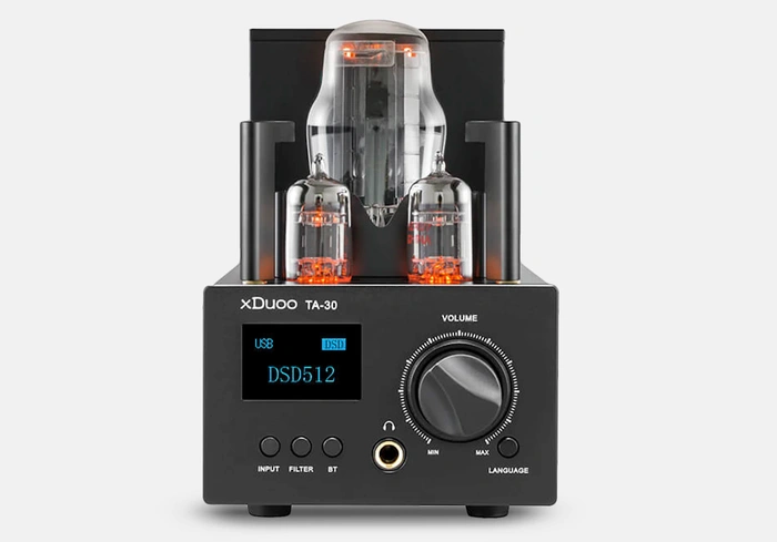 Integriert in das Design des Kopfhörerverstärkers sind zwei Röhren: eine dick klingende 5Z3P für Hoch-Spannungsgleichrichtung und eine präzise klingende ECC82-Röhre zur Audioverarbeitung. Um alle Konnektivitätsanforderungen zu erfüllen, verfügt der TA-30 über USB-, koaxiale und optische Eingänge. Es verfügt auch über Bluetooth 5.0, angetrieben von einem Qualcomm CSR8675-Chip, der die Formate SBC, AAC, aptX, aptX LL, aptX HD und LDAC unterstützt.