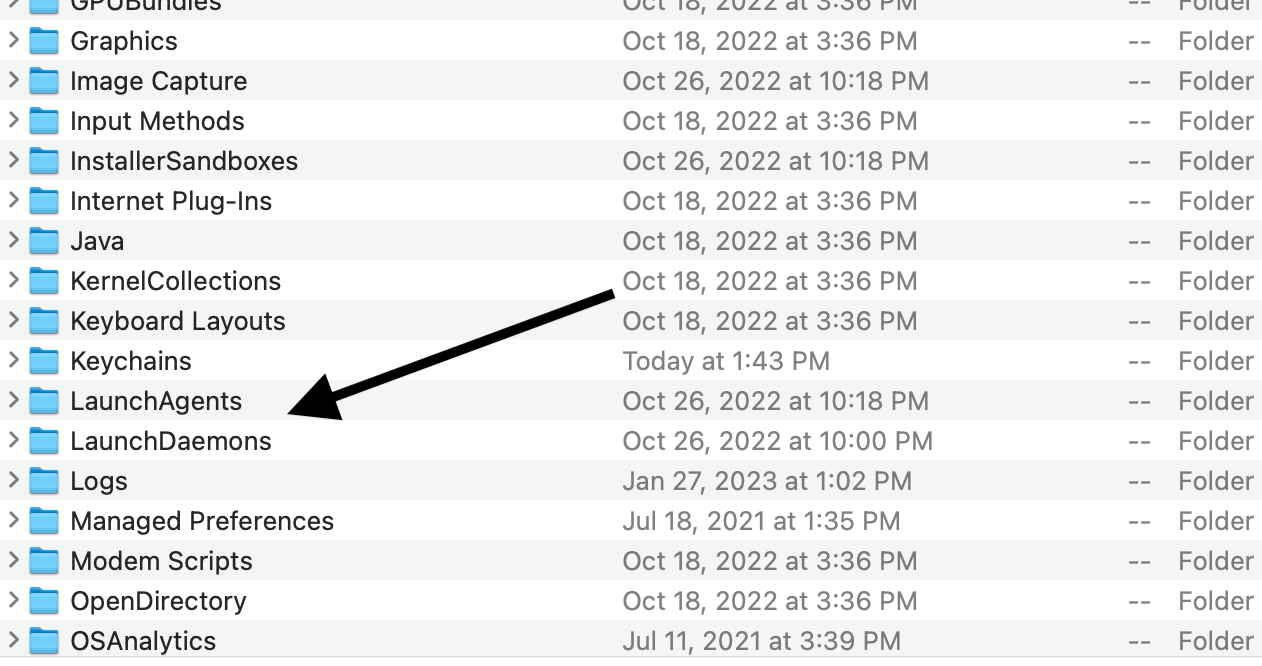 打開 Finder。點擊頂部菜單欄中的開始。然後轉到計算機 >Macintosh HD >庫。找到 LaunchAgents 和 LaunchDemons 文件夾。打開它們,看看它們是否有已卸載應用程序的殘餘。如果是這樣,請刪除它們。不要刪除屬於當前安裝的應用程序的任何內容。