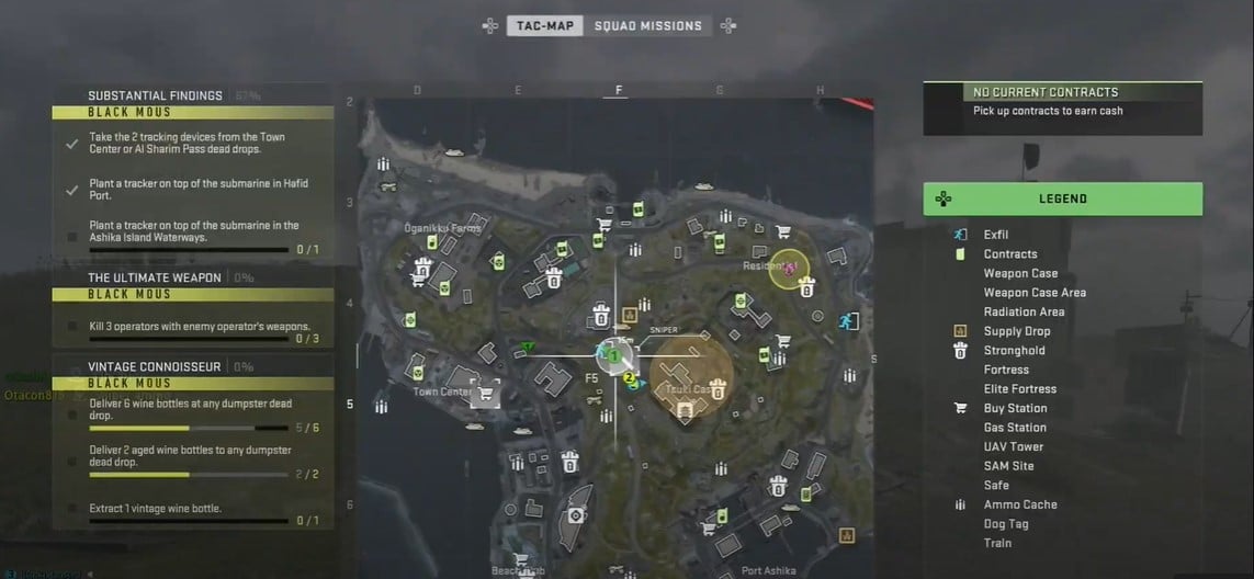 從鎮中心拿走 2 個跟踪裝置或 Al Sharim Pass Dead Drops 在海菲港的潛艇頂部放置一個追踪器 在 Ashika 島水道的潛艇頂部放置一個追踪器