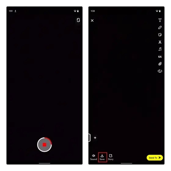 要在 Snapchat 上錄製視頻,請長按快門按鈕。出現預覽屏幕後,點擊屏幕左下角的“保存”圖標以保存您的照片或視頻。